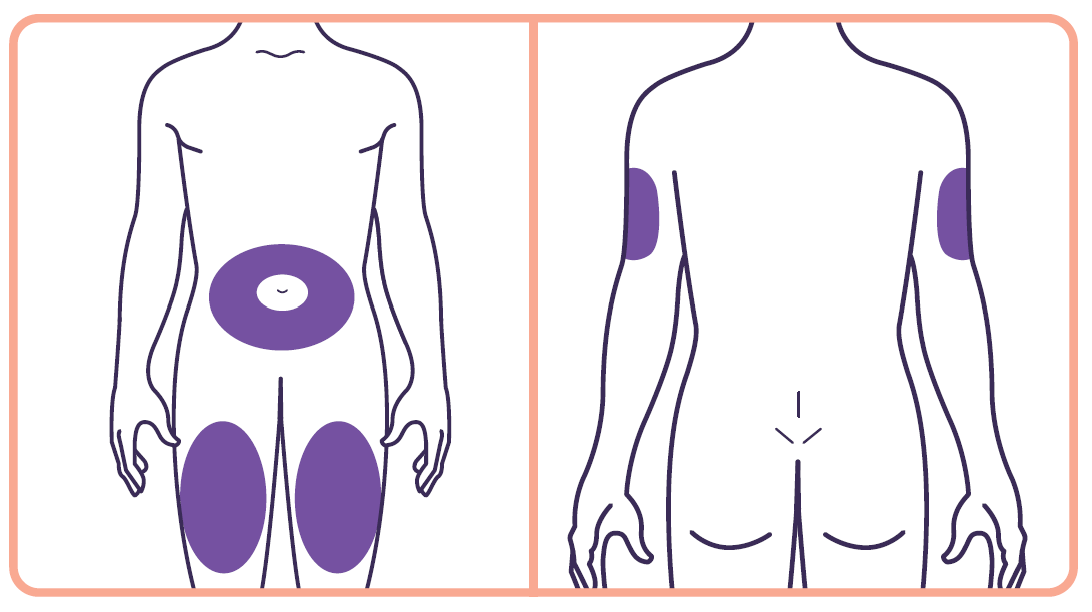 - Jijzelf of iemand anders kan het medicijn in jouw bovenbeen (dij) of buik op minimaal 5 cm afstand van de navel injecteren.